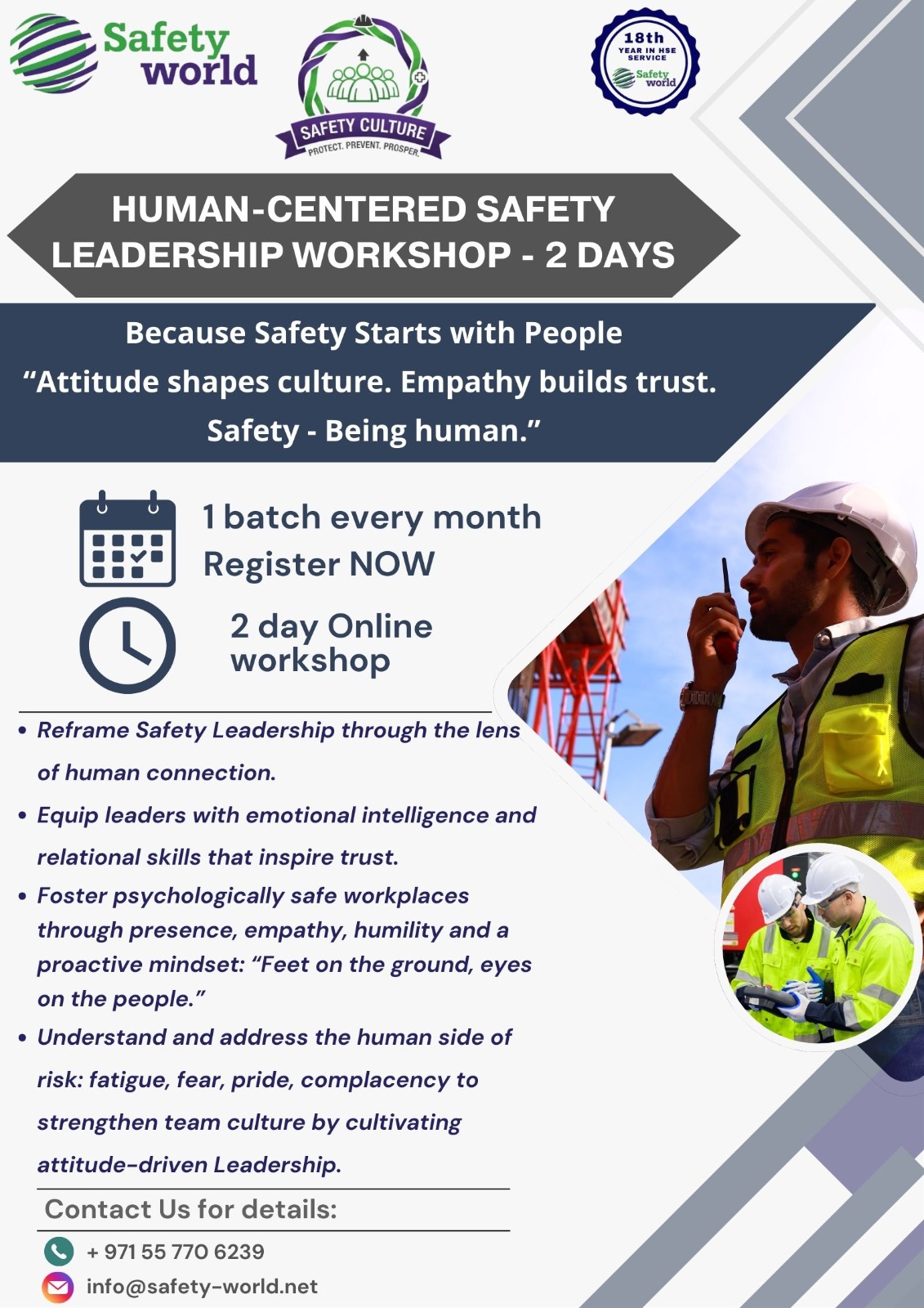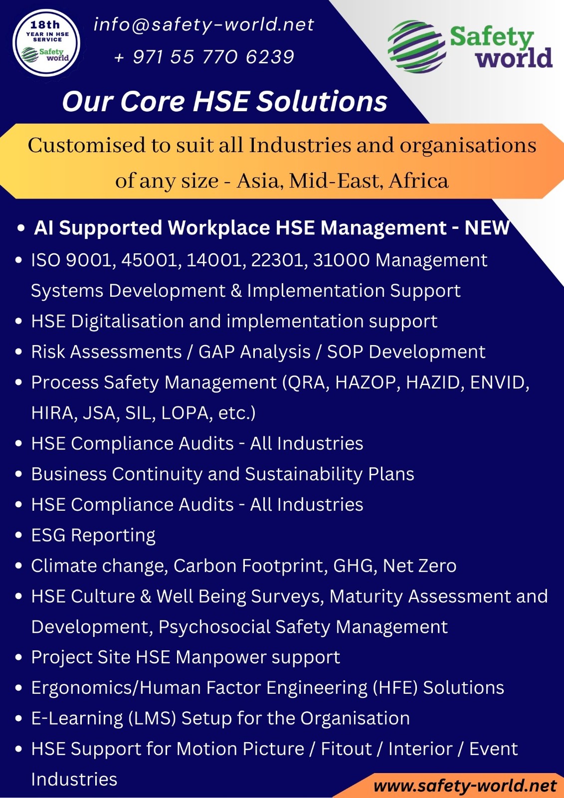 Safety World is a leading Human-Centric HSE Consultancy delivering integrated health, safety, environment, and quality solutions for over 17 years. We combine technical expertise with human-centric leadership to help organizations build resilient, high-performing safety cultures.